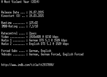 | FiLENAME: | A.Most.Violent.Year.2014.German.DTS.DL.1080p.BluRay.x264-EXQUiSiTE.mkv |