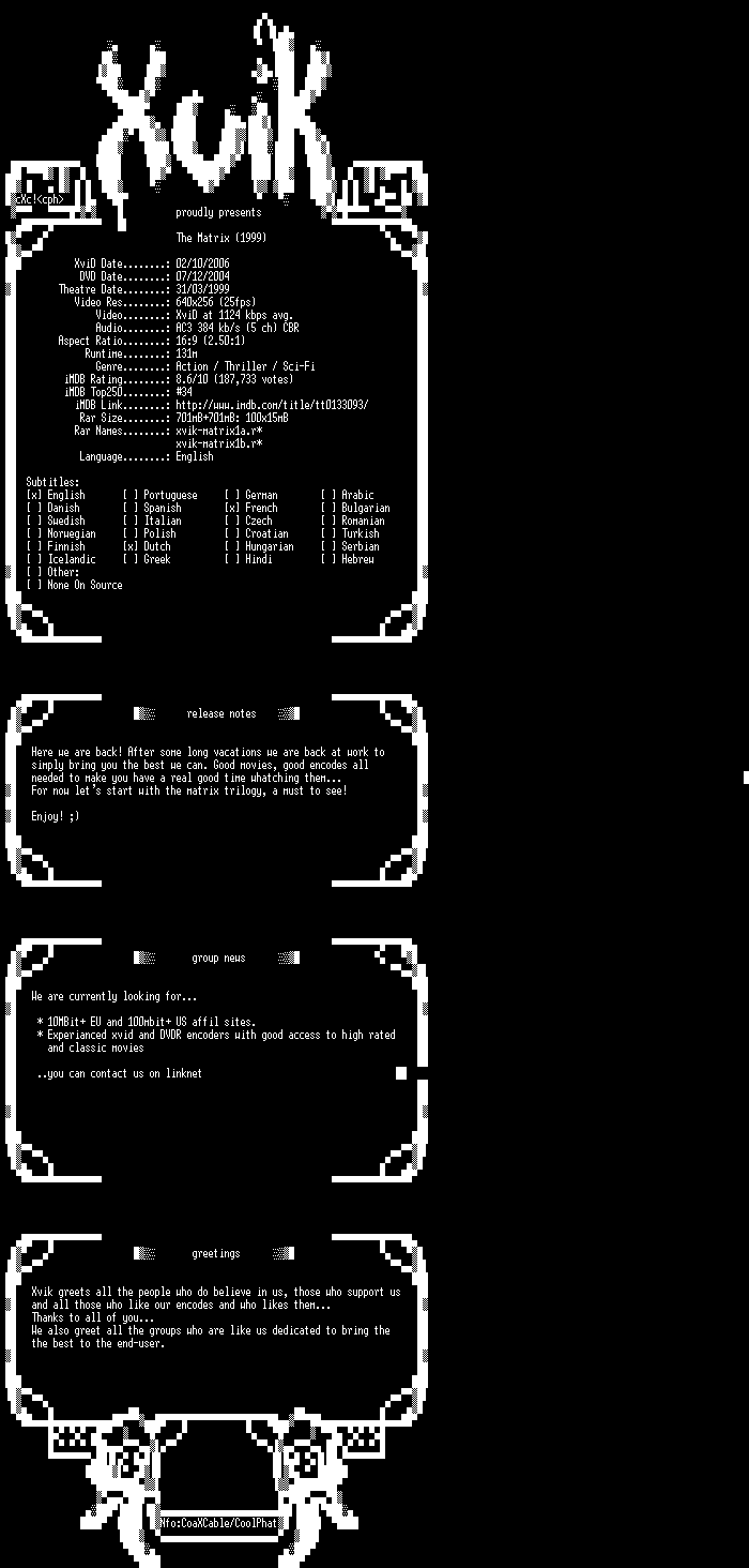 | FiLENAME: | The.Matrix.1999.iNTERNAL.DVDRip.XviD.AC3.CD1-XviK.avi |