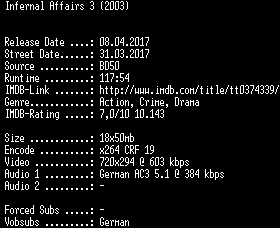 | FiLENAME: | Infernal.Affairs.3.German.REMASTERED.2003.AC3.BDRip.x264-SPiCY.mkv |
