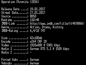 | FiLENAME: | Operation.Chromite.2016.German.1080p.BluRay.x264-SPiCY.mkv |