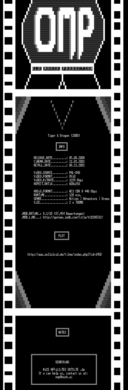 | FiLENAME: | Tiger.and.Dragon.German.2000.AC3.DVDRiP.XViD.iNTERNAL-OMP.CD2.avi |