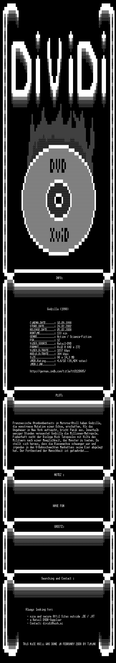 | FiLENAME: | Godzilla.German.1998.AC3.DVDRiP.XviD.iNTERNAL-DiViDi.CD1.avi |