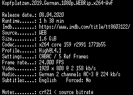 | FiLENAME: | Kopfplatzen.2019.German.1080p.WEBRip.x264-WvF.mkv |