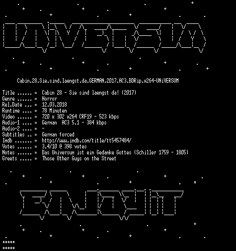 | FiLENAME: | Cabin.28.Sie.sind.laengst.da.GERMAN.2017.AC3.BDRip.x264-UNiVERSUM.mkv |