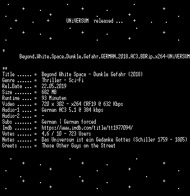 | FiLENAME: | Beyond.White.Space.Dunkle.Gefahr.GERMAN.2018.AC3.BDRip.x264-UNiVERSUM.mkv |