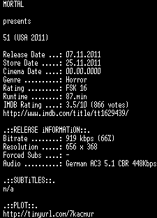 | FiLENAME: | 51.2011.German.AC3.DVDRip.XviD-MORTAL.avi |