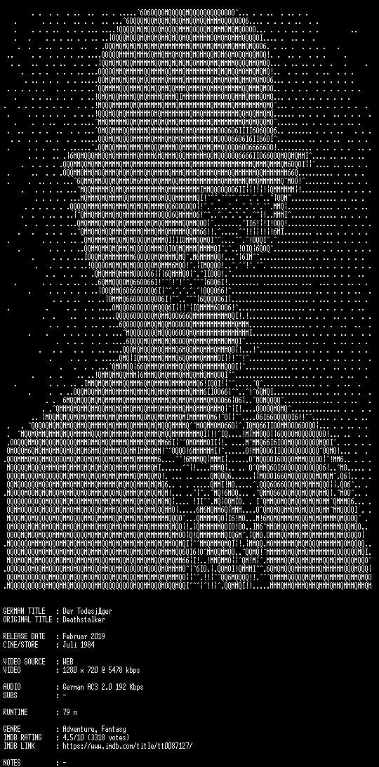 | FiLENAME: | Der.Todesjaeger.1983.German.720p.WebHD.x264-CLASSiCO.mkv |