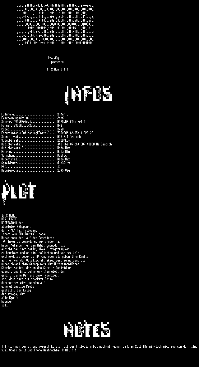 | FiLENAME: | X-Men 3 - Der letzte Widerstand (2006) [GER-AC3 WS BD].avi |