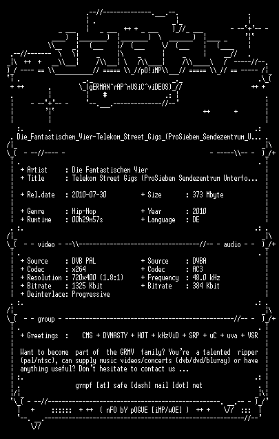 | FiLENAME: | Die_Fantastischen_Vier-Telekom_Street_Gigs_(ProSieben_Sendezentrum_Unterfoehring_23-7-2010)-x264-DE-2010-GRMV.mkv |