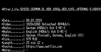 | FiLENAME: | After.Life.S01E02.GERMAN.DL.HDR.1080p.WEB.h265.iNTERNAL-EiSBOCK.mkv |
