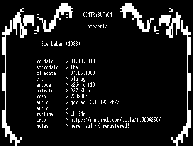 | FiLENAME: | Sie.Leben.1988.Remastered.German.BDRip.PROPER.x264-CONTRiBUTiON.mkv |