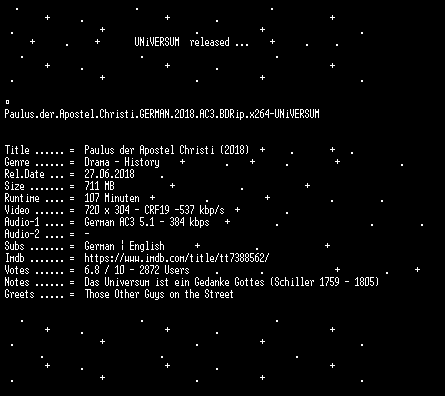| FiLENAME: | Paulus.der.Apostel.Christi.GERMAN.2018.AC3.BDRip.x264-UNiVERSUM.mkv |