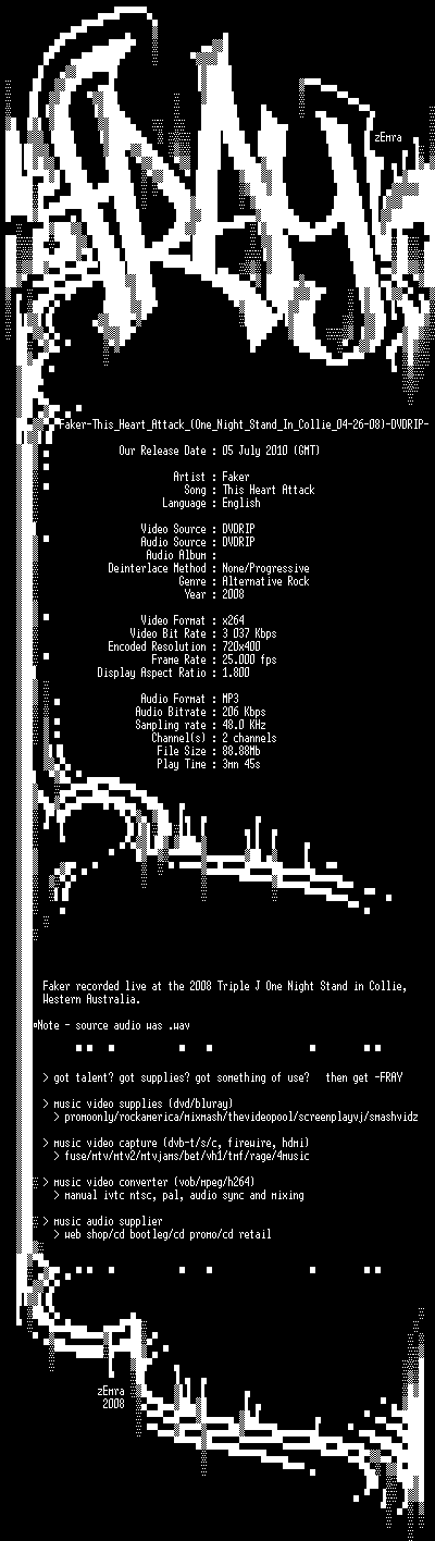 | FiLENAME: | Faker-This_Heart_Attack_(One_Night_Stand_In_Collie_04-26-08)-DVDRIP-x264-2008-FRAY.mkv |
