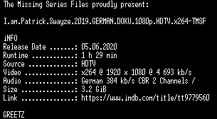 | FiLENAME: | I.am.Patrick.Swayze.2019.GERMAN.DOKU.1080p.HDTV.x264-TMSF.mkv |