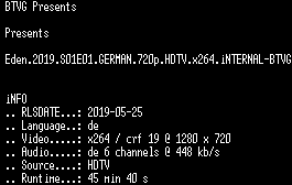 | FiLENAME: | Eden.2019.S01E01.GERMAN.720p.HDTV.x264.iNTERNAL-BTVG.mkv |
