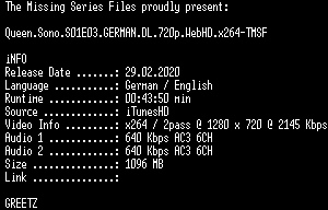 | FiLENAME: | Queen.Sono.S01E03.GERMAN.DL.720p.WebHD.x264-TMSF.mkv |