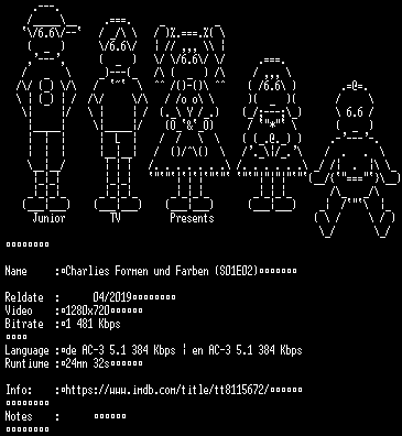 | FiLENAME: | Charlies.Formen.und.Farben.S01E02.German.720p.WEBHD.x264-JuniorTV.mkv |