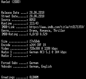 | FiLENAME: | Hamlet.German.REMASTERED.2000.AC3.BDRip.x264-SPiCY.mkv |