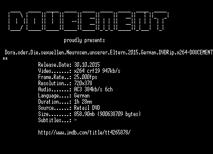| FiLENAME: | Dora.oder.Die.sexuellen.Neurosen.unserer.Eltern.2015.German.DVDRip.x264-DOUCEMENT.mkv |