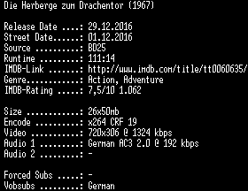 | FiLENAME: | Die.Herberge.zum.Drachentor.German.REMASTERED.1967.AC3.BDRip.x264-SPiCY.mkv |