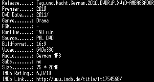| FiLENAME: | Tag.und.Nacht.German.2010.DVDRiP.XViD-AMBASSADOR.avi |