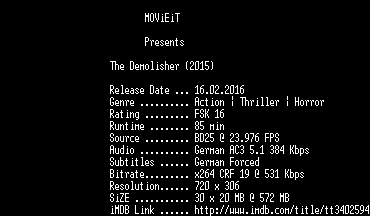 | FiLENAME: | The.Demolisher.German.2015.AC3.BDRip.x264-MOViEiT.mkv |
