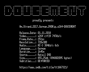 | FiLENAME: | Am.Strand.2017.German.DVDRip.x264-DOUCEMENT.mkv |