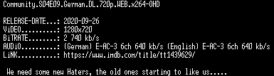 | FiLENAME: | Community.S04E09.German.DL.720p.WEB.x264-OHD.mkv |