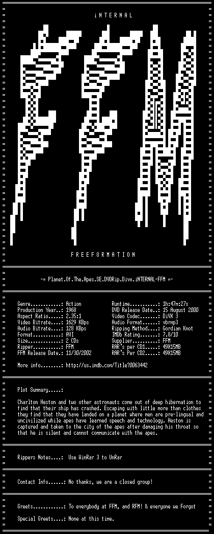 | FiLENAME: | Planet.Of.The.Apes.SE.1968.DVDRip.DivX.iNTERNAL-FFM.CD2.avi |