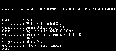 | FiLENAME: | Love.Death.and.Robots.S01E09.GERMAN.DL.HDR.1080p.WEB.h265.iNTERNAL-EiSBOCK.mkv |
