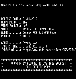 | FiLENAME: | Sand.Castle.2017.German.720p.WebHD.x264-SLG.mkv |