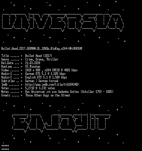 | FiLENAME: | Bullet.Head.2017.GERMAN.DL.1080p.BluRay.x264-UNiVERSUM.mkv |