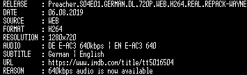 | FiLENAME: | Preacher.S04E01.GERMAN.DL.720P.WEB.H264.REAL.REPACK-WAYNE.mkv |