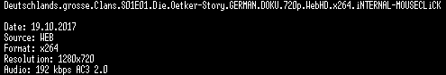 | FiLENAME: | Deutschlands.grosse.Clans.S01E01.Die.Oetker-Story.GERMAN.DOKU.720p.WebHD.x264.iNTERNAL-MOUSECLiCK.mkv |