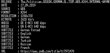 | FiLENAME: | The.Politician.S01E06.GERMAN.DL.720P.WEB.X264.INTERNAL-WAYNE.mkv |