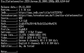 | FiLENAME: | Die.Elefantenmutter.2019.German.DL.DOKU.1080p.WEB.h264-WvF.mkv |