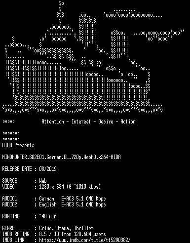 | FiLENAME: | MINDHUNTER.S02E01.German.DL.720p.WebHD.x264-AIDA.mkv |