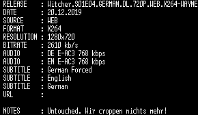 | FiLENAME: | Witcher.S01E04.GERMAN.DL.720P.WEB.X264-WAYNE.mkv |