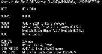 | FiLENAME: | Ghost.in.the.Shell.2017.German.DL.2160p.UHD.BluRay.x265-ENDSTATiON.mkv |