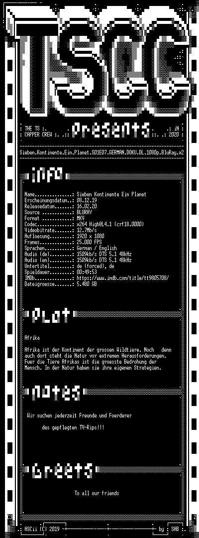 | FiLENAME: | Sieben.Kontinente.Ein.Planet.S01E07.GERMAN.DOKU.DL.1080p.BluRay.x264-TSCC.mkv |