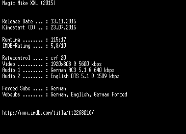 | FiLENAME: | Magic.Mike.XXL.2015.German.DL.1080p.BluRay.x264-EXQUiSiTE.mkv |