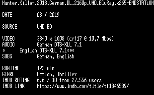 | FiLENAME: | Hunter.Killer.2018.German.DL.2160p.UHD.BluRay.x265-ENDSTATiON.mkv |