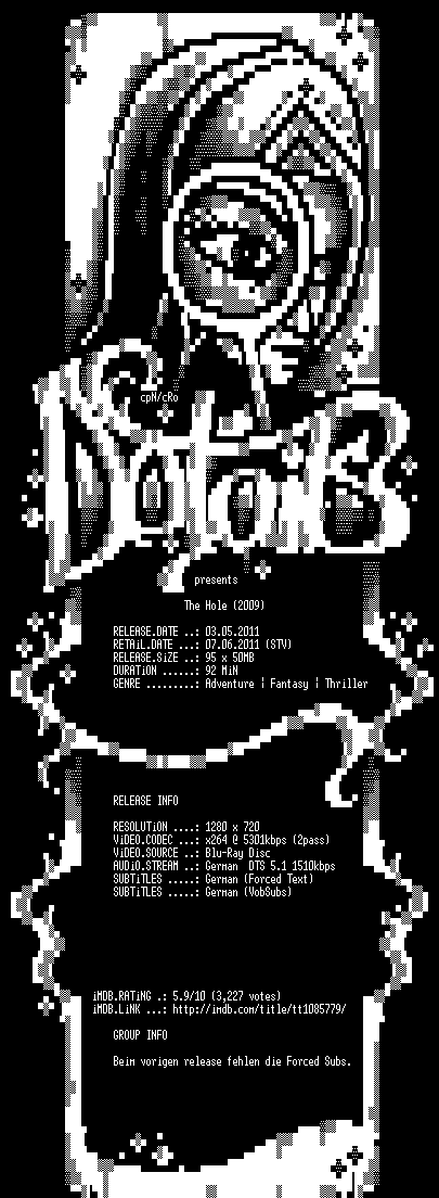 | FiLENAME: | The.Hole.2009.German.720p.BluRay.x264.PROPER-DETAiLS.mkv |