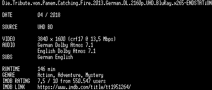 | FiLENAME: | Die.Tribute.von.Panem.Catching.Fire.2013.German.DL.2160p.UHD.BluRay.x265-ENDSTATiON.mkv |