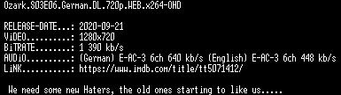| FiLENAME: | Ozark.S03E06.German.DL.720p.WEB.x264-OHD.mkv |