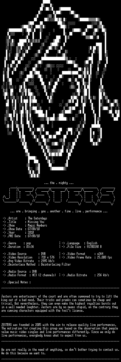 | FiLENAME: | The_saturdays-missing_you_(live_magic_numbers_07-08-10)-x264-2010-JESTERS.mkv |