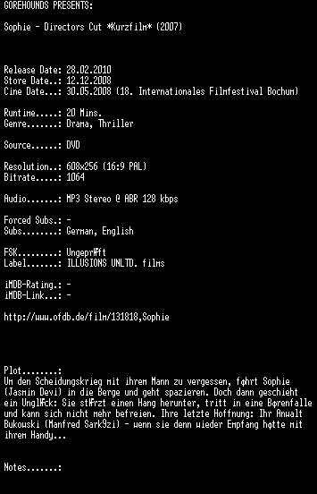 | FiLENAME: | Sophie.Directors.Cut.German.2007.DVDRiP.XViD-GOREHOUNDS.avi |