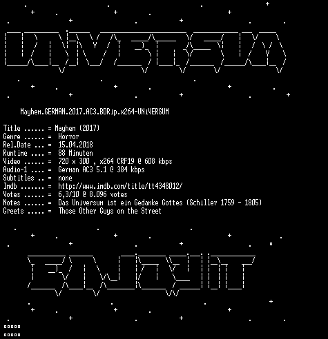 | FiLENAME: | Mayhem.GERMAN.2017.AC3.BDRip.x264-UNiVERSUM.mkv |