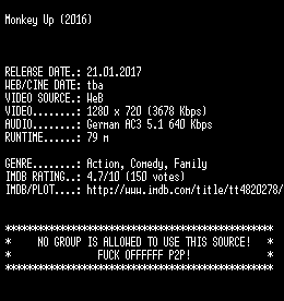| FiLENAME: | Monkey.Up.2016.German.720p.WebHD.x264-SLG.mkv |