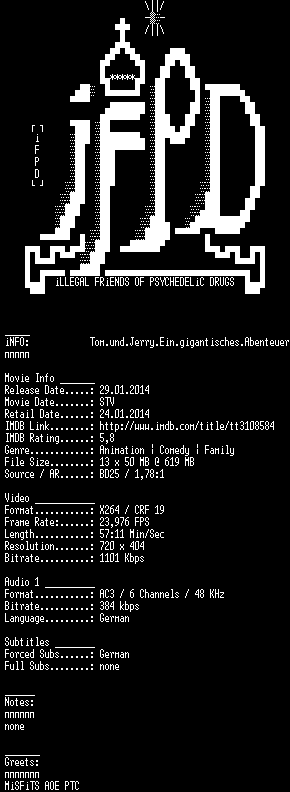 | FiLENAME: | Tom.und.Jerry.Ein.gigantisches.Abenteuer.German.2013.AC3.BDRiP.x264-iFPD.mkv |